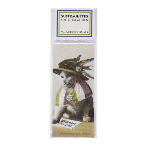 This magnetic bookmark depicts an image from a commercially produced picture postcard titled 'An Advokate for Women's Right's' (c.1908-12) of a cat dressed as a suffragette satirising the Suffragette campaign.