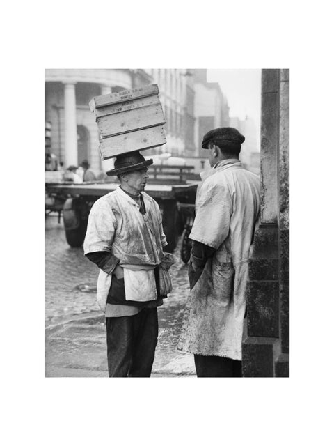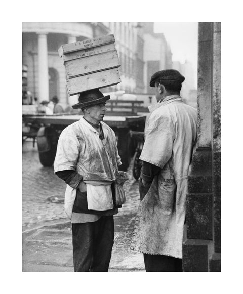 This image shows two fish porters in conversation outside Billingsgate Fish Market, Lower Thames Street, 1958. One man is carrying three boxes on top of his traditional flat-topped bobbin hat.