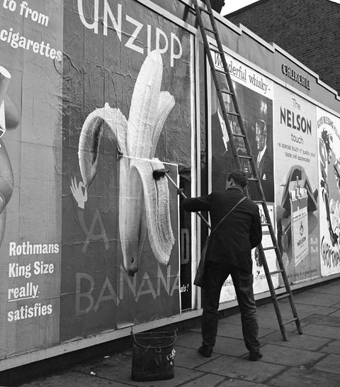 A man uses a brush to paste up a billboard advertisement which reads 'Unzipp A Banana'. On either side of him is a bucket and a ladder. There is a row of posters on the surrounding billboards, including adverts for Rothmans and Nelson cigarettes and for whisky.