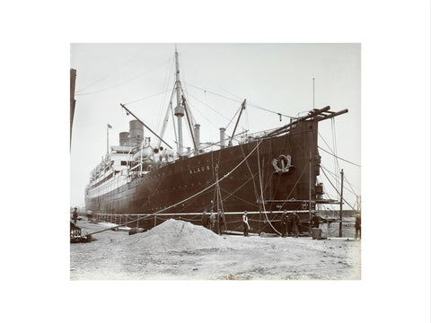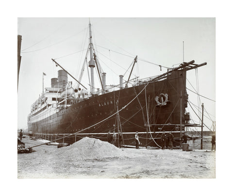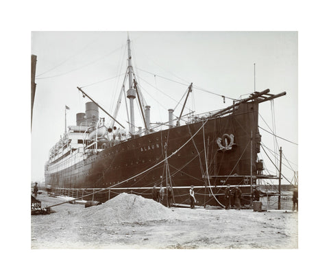 Cunard ship Alaunia in Royal Albert Dock. The Alaunia is under repair in the newly complete dry dock. June 1914.