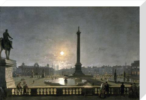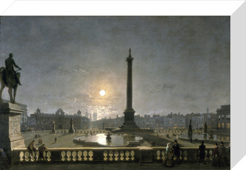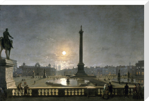 Northumberland House & Whitehall from the North Side of Trafalgar Square, by Moonlight. Oil on canvas. Moonlight view of Trafalgar Square from the balustrade on north side and looking south-east down Whitehall; a number of figures can be seen in foreground and two or three cabs in distance on the left and right. Beyond the square it can be seen part of Morley's Hotel, Northumberland House, Whitehall with Big Ben and Victoria Tower in the distance. Le Sueur's equestrian statue of Charles I, offices and shops of Charing Cross and Cockspur Street, top of Duke of York's column, Carlton Hotel Terrace, and the Union Club can also be seen in the distance.