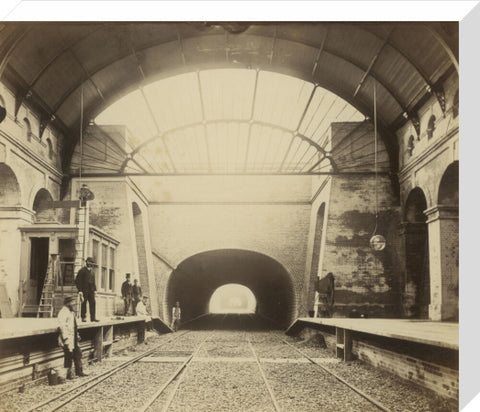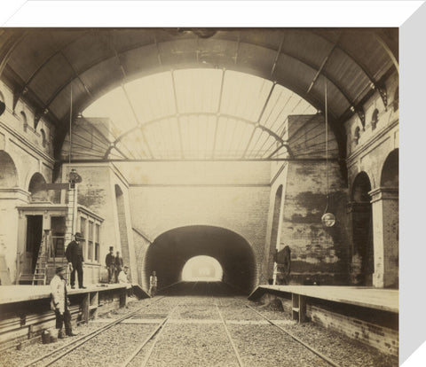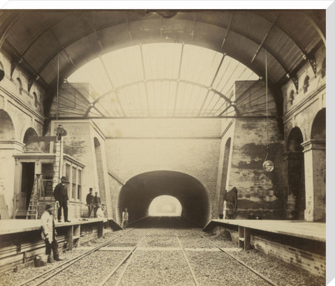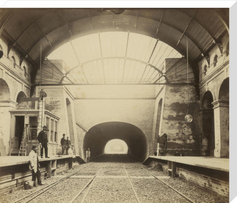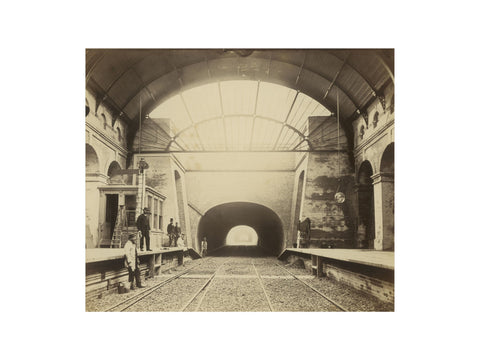 The interior of the completed Paddington (Praed Street) Station, looking east towards Edgeware Road. The photographer's portable darkroom can be seen at the end of the westbound platform. From a series of 64 photographs taken in the late 1860s by Henry Flather to document the construction of the railway from Paddington to Blackfriars via Kensington, Westminster and the new Victoria Embankment. Construction was by the 'cut-and-cover' method used to build the first underground railways before the development of the tunneling shield by James Henry Greathead . The first tunneled, or 'tube', railway in London was the City & South London Line, which opened in 1890.